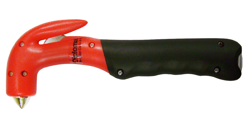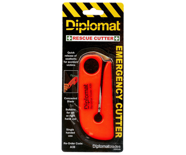 For quick safe cutting of seat belt and clothing for accident victims. Convenient finger hole to assist safe cut. Also suitable for use in Warehousing and packaging operations.